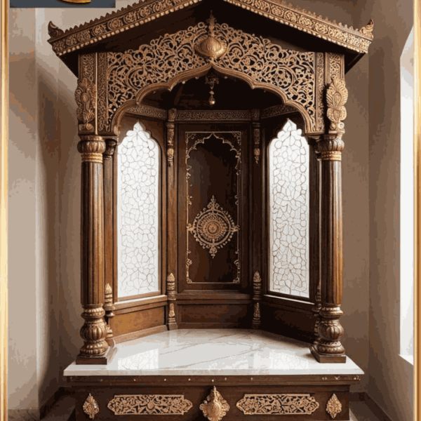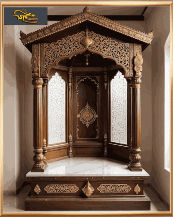 - Wooden modern style mandir is created inspired by real Hindu temples.