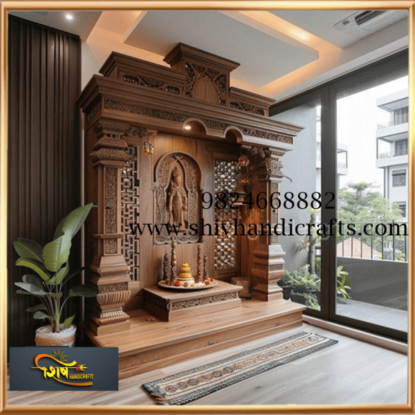 - Wooden modern style mandir is created inspired by real Hindu temples.